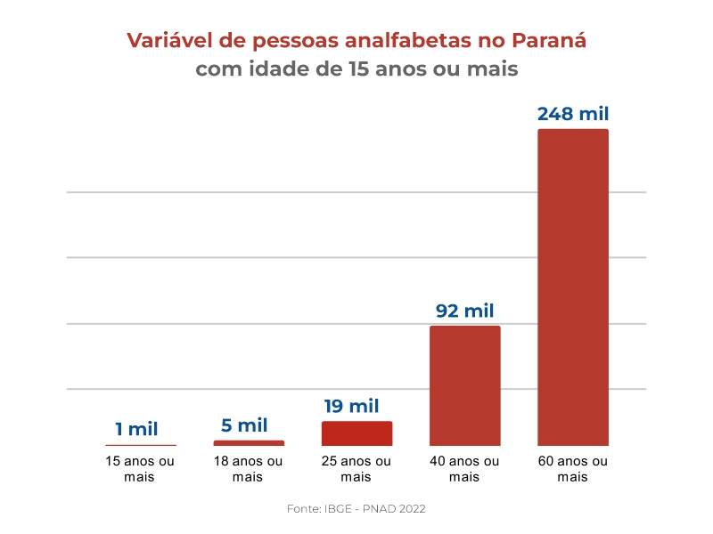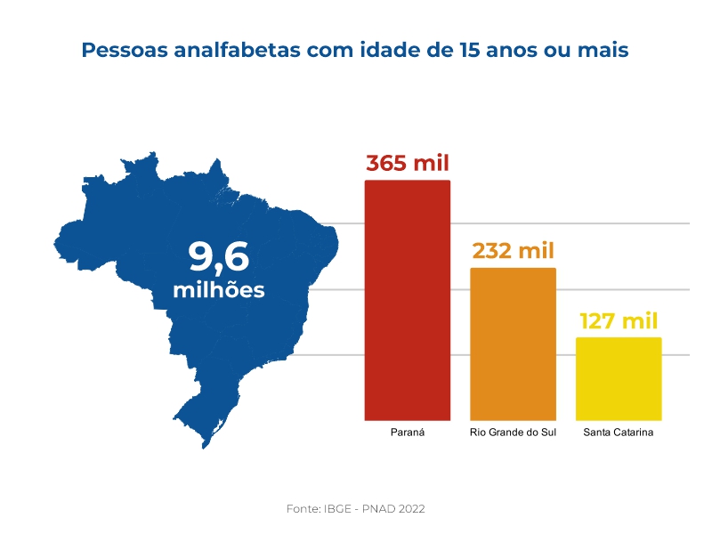 Dados da última Pesquisa Nacional por Amostra de Domicílios (PNAD) Contínua: Educação 2022, divulgados pelo Instituto Brasileiro de Geografia e Estatística (IBGE), o Paraná possui mais de 365 mil (3,9%) pessoas com 15 anos ou mais que não sabem ler nem escrever.