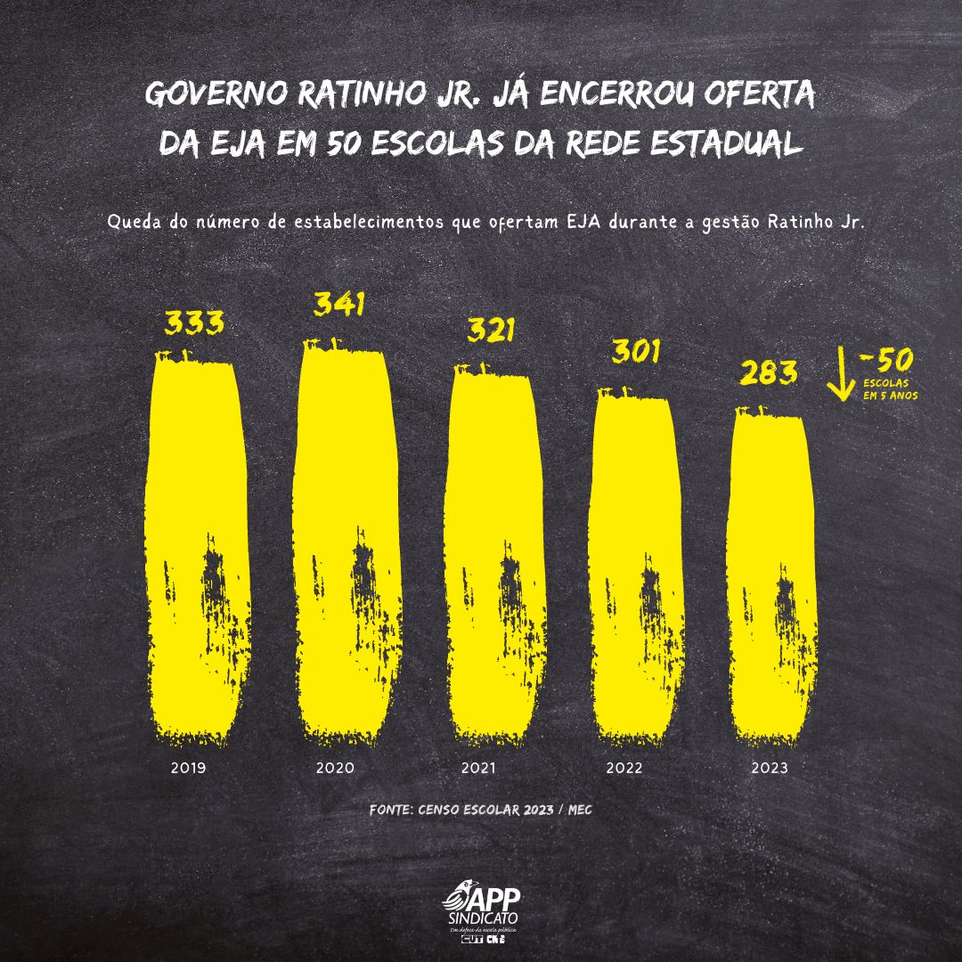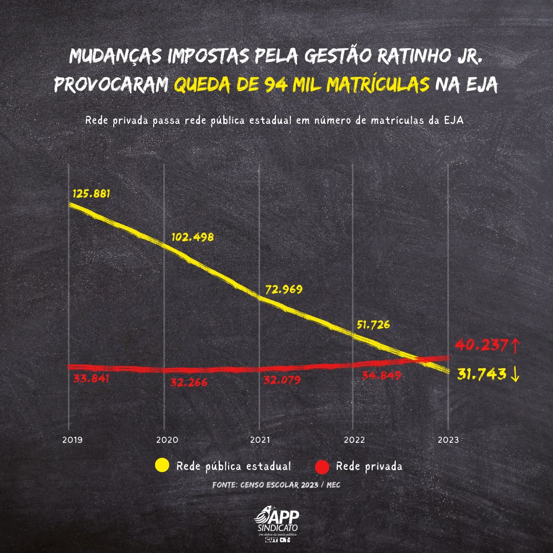 Os dados do Censo Escolar 2023, divulgados pelo Ministério da Educação (MEC) e o Instituto Nacional de Estudos e Pesquisas Educacionais Anísio Teixeira (Inep) na última quinta-feira (22), revelam o tamanho do estrago provocado pelas políticas impostas pela gestão do governador Ratinho Jr. na Educação de Jovens e Adultos (EJA) do Paraná.