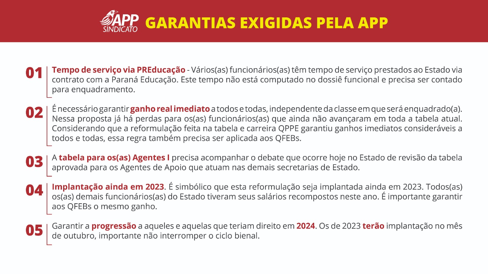 Dar celeridade à proposta de reestruturação da carreira QFEB com o objetivo de aprová-la na Assembleia Legislativa ainda neste ano. Segundo o novo diretor-geral da Seed, João Luiz Giona Junior, esta é uma das metas prioritárias definidas pelo secretário Roni Miranda.