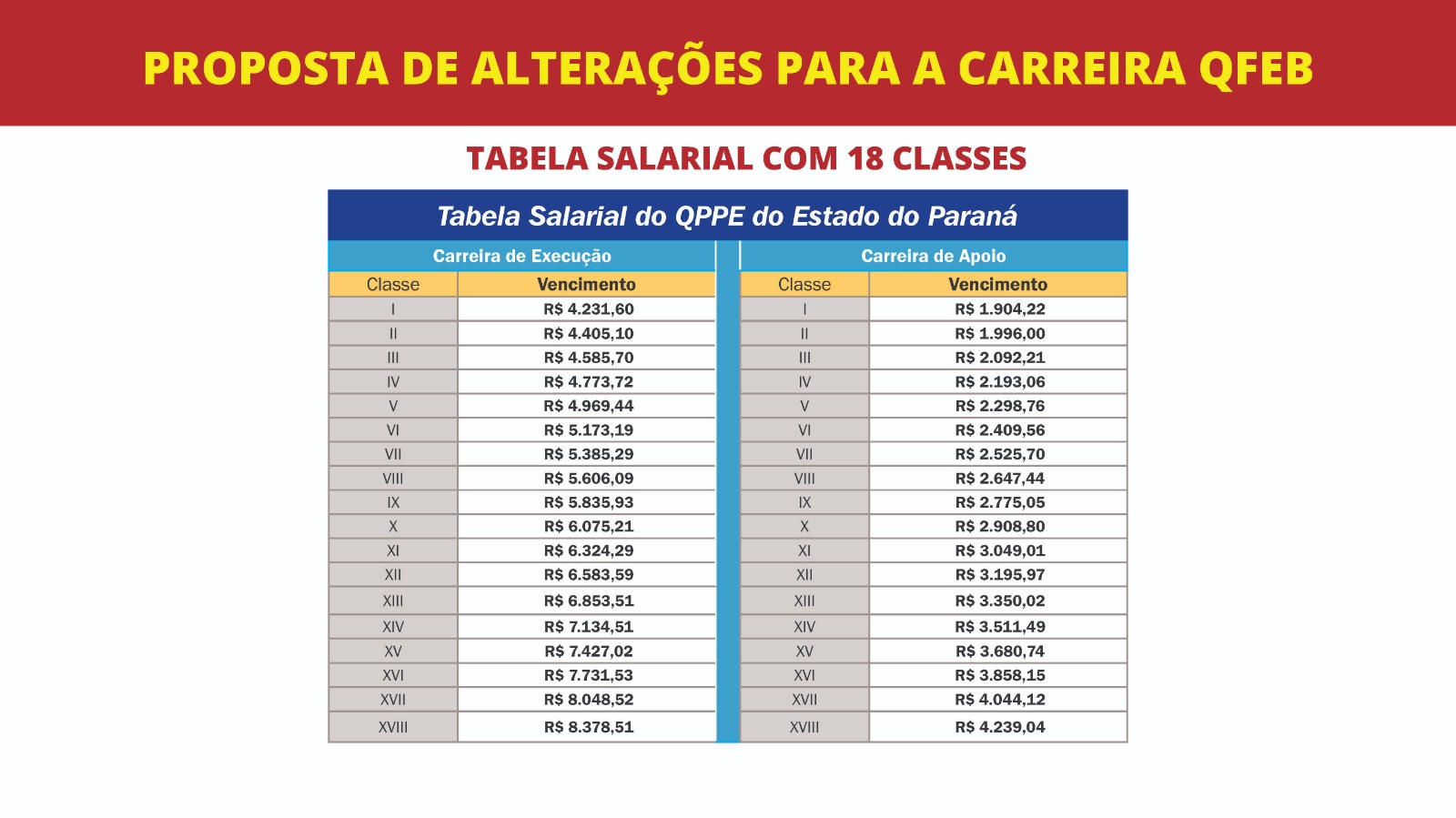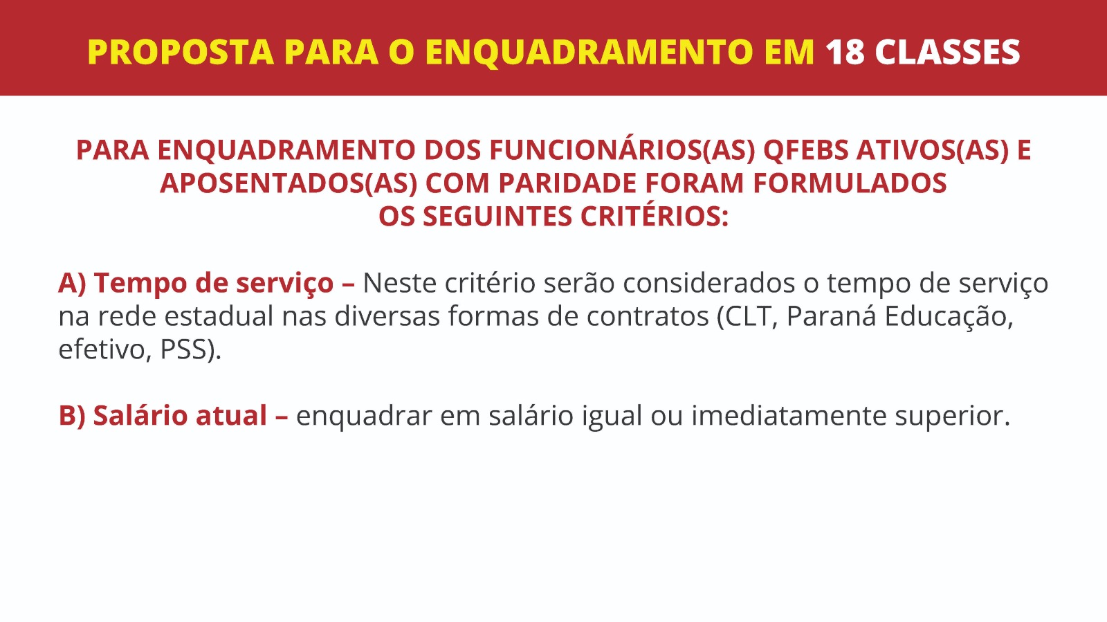 O Sindicato também cobra da Seed uma devolutiva a respeito da fórmula de enquadramento proposta ao grupo de trabalho. Confira, abaixo, os slides apresentados com a contextualização do debate e as tabelas salariais.