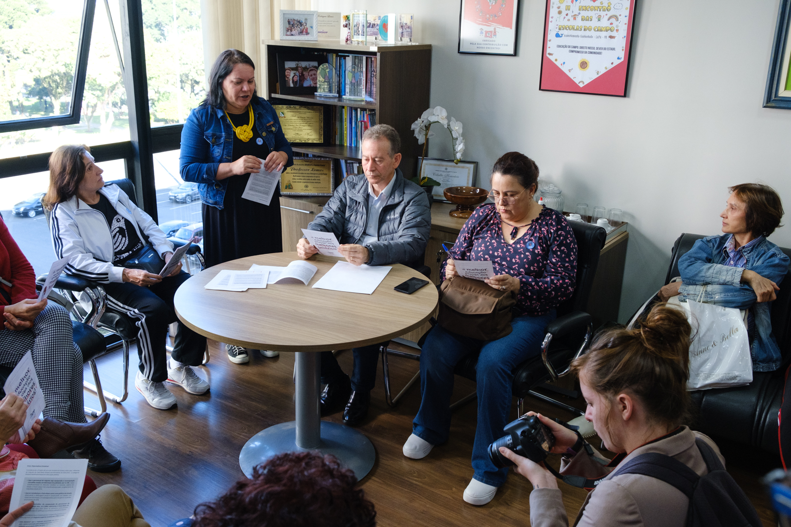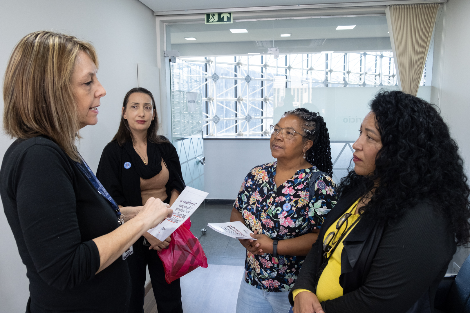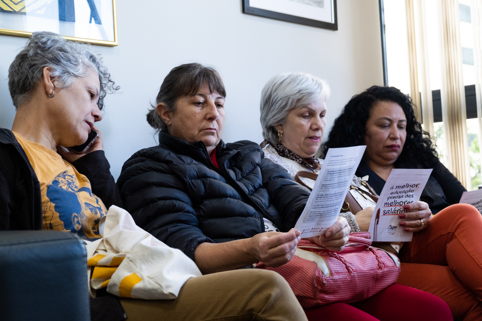 Organizados(as) em grupos pela manhã, educadores(as) na ativa e aposentados(as) entregaram um material impresso com a pauta da categoria aos(às) parlamentares. À tarde, a comitiva acompanhou a sessão no Plenário e aproveitou para ampliar a pressão.