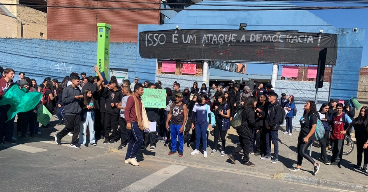Os(as) estudantes se organizaram no pátio e saíram em passeata clamando por justiça. Eles(as) fecharam o tráfego na avenida Francisco Krueger, onde fica o colégio, com faixas com as mensagens “Juntos pela Cleuza”, “Queremos a direção que elegemos” e “Fora inimigos da educação”.