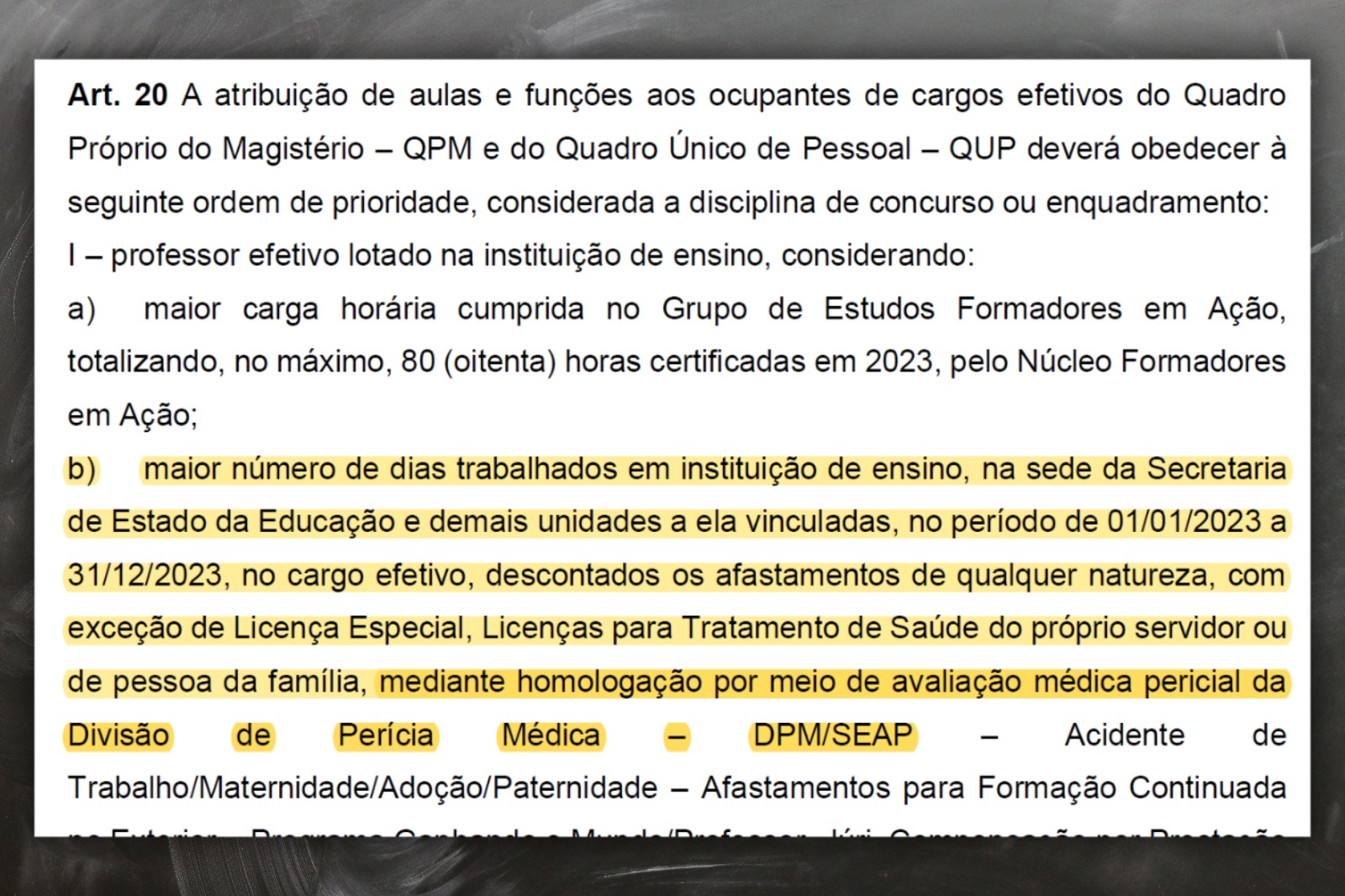 O “castigo” se dá porque, desde 2023, a resolução de distribuição de aulas publicada pela Secretaria da Educação prejudica a classificação de quem se ausentou por até três dias; período em que é possível apresentar atestado médico sem a necessidade de passar pela perícia do Estado.