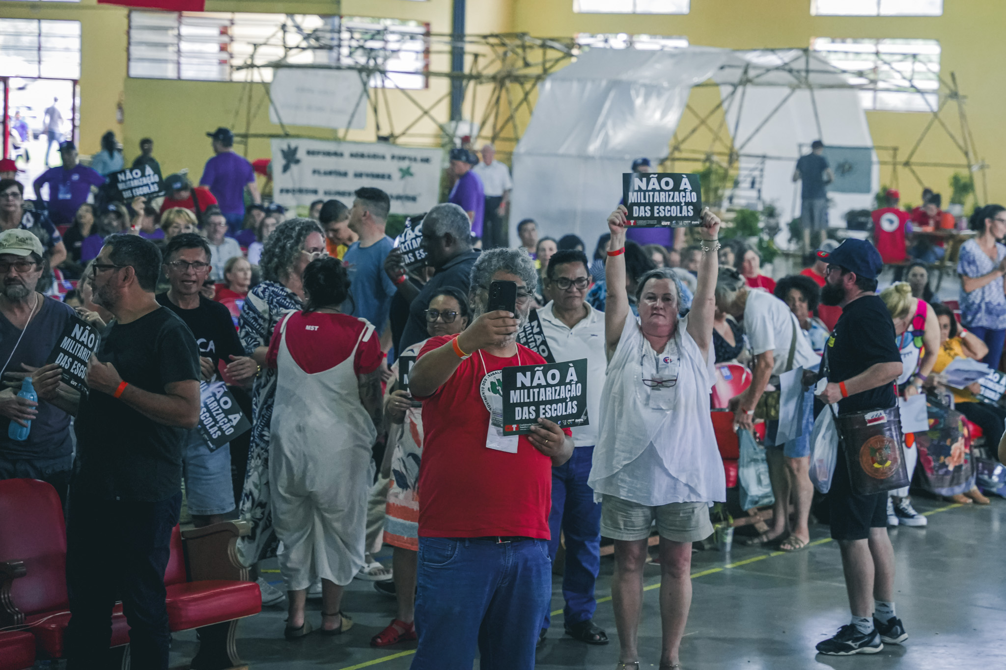 “Estes ataques incluem a terceirização de trabalhadores, a erosão da autonomia pedagógica e da gestão democrática, além da militarização de escolas”, explica o dirigente. “Também vivenciamos a reforma do ensino médio, resultando no esvaziamento de conteúdos científicos no currículo. Esse cenário se agrava com a imposição do uso de plataformas digitais, que causa o adoecimento dos(as) professores(as)”, afirma.