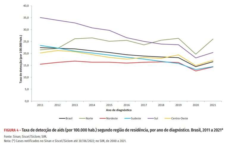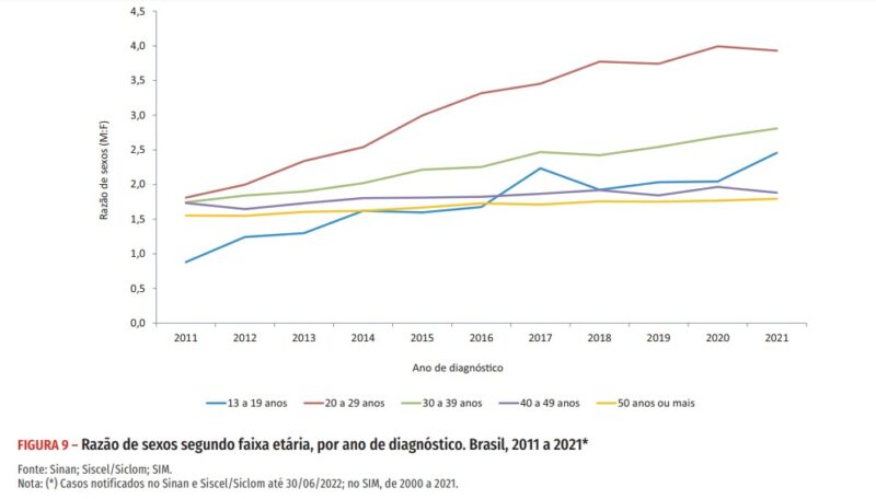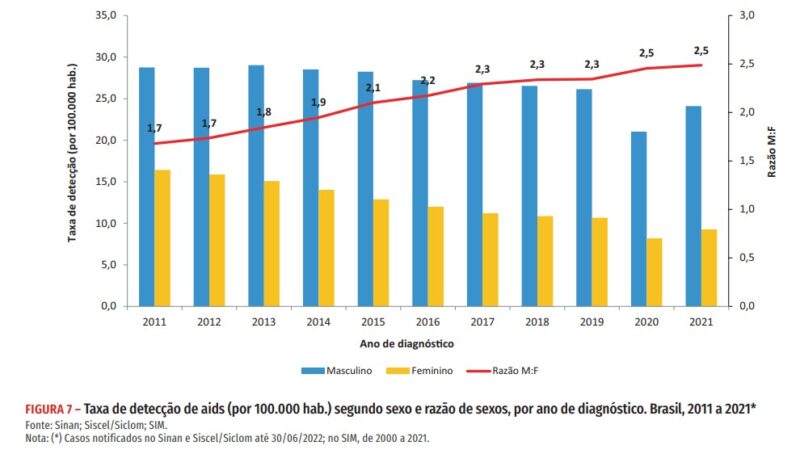 Segundo o documento, entre 2007 e junho de 2022, foram 102.869 casos (23,7%) nessa população, sendo 25,2% em pessoas do sexo masculino e 19,9% nas do sexo feminino. Além disso, em 2021, a ocorrência de novas infecções pelo HIV em mulheres entre 15 e 34 anos representou 45,6% dos casos.
