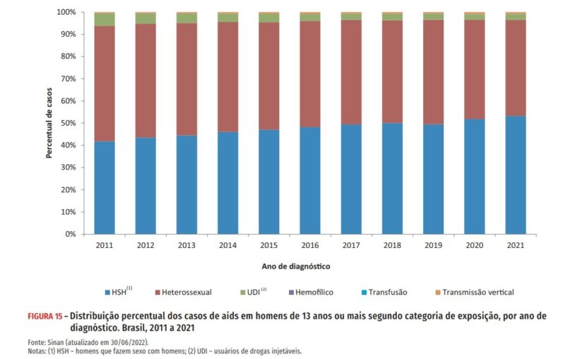 O Boletim acrescenta ainda que entre indivíduos com 13 anos ou mais de idade, a principal via de transmissão em 2021 foi a sexual, tanto em homens (77,8%) quanto em mulheres (84,7%).